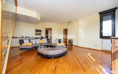 Nel prestigioso complesso Les Maisones di Pessano con Bornago, elegante e riservato, circondato da un magnifico giardino condominiale curato come un parco privato, proponiamo in vendita un attico unico nel suo genere, caratterizzato da ampi spazi, luminosità e privacy assoluta. L'ingresso si apre su un soggiorno di metratura introvabile, ambiente raffinato e accogliente dove la luce naturale entra da grandi finestre affacciate sul verde. La cucina abitabile, spaziosa e ben distribuita, si collega al balcone vivibile, ideale per pranzi all'aperto e momenti di relax. Completano il piano due camere da letto e un bagno padronale con vasca, pensato per offrire comfort e benessere quotidiano. Al piano mansardato si trova il secondo bagno e una splendida camera matrimoniale dal fascino intimo e riservato. Il piano superiore è poi arricchito da camino e angolo cottura: un ambiente versatile che può essere utilizzato come suite privata, studio o spazio relax. Da qui si accede al terrazzo panoramico di 70 mq, completamente libero su quattro lati: un'oasi sospesa dove vivere appieno la bellezza del cielo e la quiete del contesto circostante. Perfetto per cene estive, serate tra amici o semplicemente per godere di un tramonto in totale privacy. L'attico si trova in un contesto condominiale signorile, curato nei dettagli e immerso nel verde, ideale per chi cerca tranquillità senza rinunciare alla comodità dei servizi. Les Maisones di Pessano rappresentano una delle realtà abitative più apprezzate della cittadina, grazie alla loro armonia architettonica e alla qualità costruttiva. Un'abitazione che combina spazio, luce ed eleganza, pensata per chi desidera vivere ogni giorno in un ambiente esclusivo e riservato. Qui la casa non è solo un luogo, ma un'emozione: una finestra aperta sul verde, un terrazzo sospeso tra cielo e quiete. Per maggior - Classe: E