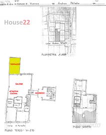Con una superficie generosa di ben 190 mq, l'appartamento è caratterizzato da spazi luminosi e accoglienti. L'ingresso conduce a un ampio salone che affaccia su una terrazza abitabile privata; qui potrete godere della vista mozzafiato sui tipici tetti vicentini, perfetta per momenti di relax o intrattenimento con amici e familiari. Il soggiorno è predisposto per ospitare una cucina a vista moderna.