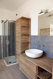 bagno moderno con doccia e finiture in legno;