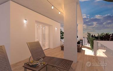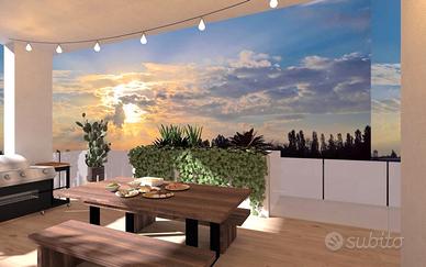 Internamente l'attico viene proposto così suddiviso: ingresso diretto nella zona giorno, con un salone di 70 mq. con tre accessi al terrazzo della zona giorno, cucina abitabile di 20 mq. con accesso al terrazzo, doppio ripostiglio esterno sul terrazzo, per contenere gli accessori della zona esterna, due bagni finestrati, doppio eccesso alla zona notte, con quattro camere da letto matrimoniali suitte, con cabina armadi e bagno privato ogniuna e accesso al terrazzo della zona notte, uno studio e una lavanderia, due ripostigli esterni sul terrazzo della zona notte per il ricovero degli accessori esterni.