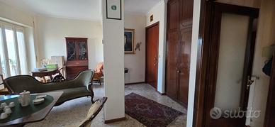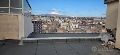 La proprietà conta mq. 87 interni e si articola come segue: ingresso su un ampio salone (divisibile) che presenta ben 3 aperture che aprono su un panoramico e gradevole terrazzino con affaccio su via Canfora, un piccolo disimpegno, una cucina abitabile, una camera da letto ed un bagno. In aggiunta al terrazzino esterno l'immobile presenta un balcone con affaccio interno. Soprastante insiste un panoramicissimo (vista mare e montagna) e ampio terrazzo (proprietà esclusiva) di mq. 75 ca. Luminoso, panoramico, doppia esposizione, discrete condizioni, climatizzato.