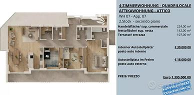 Rf.nr.: M263-att In questo edificio di nuova costruzione di alta qualità La attende un esclusivo attico quadrilocale con una superficie complessiva di 224 m². L'unità, caratterizzata da una distribuzione interna ben studiata, dispone di una luminosa zona giorno con cucina, tre confortevoli camere da letto, due eleganti bagni e un WC separato. Un vero punto di forza è l'ampia terrazza di 107,00 m², che offre uno spazio ideale per rilassarsi all'aperto e valorizza ulteriormente l'esperienza abitativa. L'edificio sarà realizzato secondo criteri costruttivi sostenibili ed efficienti dal punto di vista energetico, rispettando gli elevati standard CasaClima A. La consegna chiavi in mano garantisce un'elevata qualità costruttiva e tempi di realizzazione contenuti. Gli appartamenti si distinguono per una distribuzione degli spazi ben studiata, un concetto abitativo moderno e un'atmosfera particolarmente accogliente. Le ampie superfici vetrate assicurano ambienti luminosi e ariosi. Ogni unità dispone inoltre di una terrazza e/o di un balcone. Per il parcheggio sono disponibili posti auto in garage al prezzo di 30.000 € e posti auto esterni a 18.000 €. Alcuni appartamenti sono dotati di una spaziosa cantina direttamente collegati alle unità abitative, utilizzabili come deposito, hobby room o spazio di lavoro (prezzo a parte - vedi planimetrie). Poiché l'immobile è convenzionato, può essere abitato esclusivamente da persone che risiedono in Alto Adige da almeno cinque anni oppure che dispongono di un valido contratto di lavoro in Alto Adige. Consegna: fine 2026 Riscaldamento: riscaldamento centralizzato a pavimento con teleriscaldamento Classe energetica: CasaClima A Tipologia di consegna: chiavi in mano Al fine di tutelare la privacy, precisiamo che gli indirizzi presenti negli annunci sono puramente indicativi. Per visionare l'immobile o ricevere ulteriori informazioni siamo a disposizione! Questo immobile in vendita viene proposto dall'agenzia immob