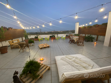 In zona Loseto, vendesi rifinito e luminoso appartamento con ampio terrazzo panoramico. L'immobile, pronto per essere abitato, si sviluppa su due superfici con l'abitazione di 90 mq posta al sesto piano con ascensore e il terrazzo di 100mq al settimo piano. I due ambienti sono collegati da una elegante scala interna in legno. L'immobile è composto da 3 vani: salone, due camere da letto, ampia cucina abitabile, ripostiglio, bagno, lavanderia e balcone. La posizione e il piano alto donano all'appartamento una notevole luminosità e una gradevole vista panoramica con uno scorcio di mare. L'appartamento, recentemente ristrutturato, si presenta in ottime condizioni ed è caratterizzato da un'atmosfera calda e raffinata. Gli interni sono stati curati nei minimi dettagli con finiture di pregio e materiali di alta qualità: pavimentazione in grès porcellanato effetto pietra di grande formato (120x120cm), porte interne GP con serratura magnetica e cerniere a scomparsa, interruttori BTICINO Living now con retro illuminazione a led, bagno con pavimentazione in grès porcellanato effetto legno e rivestimenti MARAZZI con piatto doccia a pavimento e cromoterapia, impianto di allarme con video sorveglianza, riscaldamento autonomo con caldaia a condensazione e termostato intelligente a gestione remota, impianto di climatizzazione, luci d'emergenza, impianto elettrico nuovo e certificato, porta blindata in tinta con le pareti interne, grate antintrusione. Inoltre, sono presenti arredi fissi quali armadio a 6 ante e sottoscala contenitore di falegnameria. L'immobile dispone di posto auto in cortile condominiale con accesso attraverso cancello elettrico.