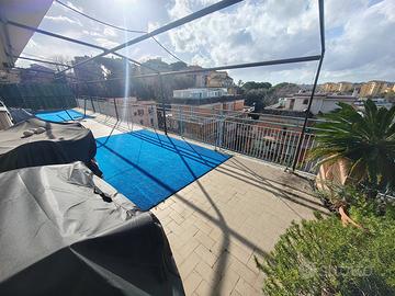 Vicino Metro San Paolo e Università Roma 3. Attico di rappresentanza con terrazzo panoramico di 100mq con 3 accessi, vista aperta su tutta Roma dotato inoltre di doppio sistema di illuminazione, 2 punti acqua, linea gas a norma (con barbecue), prese tv e tvsat , prese elettriche. Superficie interna 155 mq commerciali. 2 balconcini. Sistema d'allarme programmabile con combinatore telefonico, sensori di rilevamento movimento wired e sensori dedicati per perdite di acqua e di gas collegati ad elettrovalvole di chiusura linea gas e linea acqua, infissi con vetro antisfondamento (18mm) e controtelaio in metallo e portone d'ingresso blindato. Grande cucina abitabile con dispensa e lavanderia. Illuminazione di pregio. Impianto elettrico con oltre 250 punti luce, 13 linee elettriche indipendenti e 13 magnetotermici ed allaccio alla rete a 6.6kW. Impianto tv e tvsat in ogni stanza. Fibra internet. Lampade e faretti Artemide e Flos Telefoni con centralino elettronico, con interni in ogni stanza programmabili e collegati al citofono. Pavimenti in pietre pregiate o parquet in essenza piena. Rivestimenti pareti bagni in marmi pregiati. Porte Ghost della Rimadesio. Tre bagni di cui 2 "en suite" più un bagno ospiti arricchito da marmi pregiati con lavandino in fusione di bronzo di un famoso artista. Bagno padronale con bagno turco Jacuzzi (con integrati idromassaggio, telefono e radio) e vasca Jacuzzi con idromassaggio a 6 posti. Ampio salone con opera muraria di una famosa artista, schermo per cinema elettrico a scomparsa dal soffitto, impianto dolby 5.1 e doppi attacchi audio video per proiettore. Secondo impianto dolby 5.1 nella camera padronale. Riscald. autonomo, caldaia in classe 5. Aria condizionata con pompe di calore caldo freddo in salone e nella camera padronale. Possibilità di acquisto di un box 32 mq nello stesso stabile dotato di serranda elettrica e antifurto, nel garage condominiale accessibile con ascensore diretto. NO AGENZIE