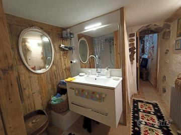 piano primo : cucina in massello di rovere con pavimentazione coordinata, camera matrimoniale e bagno caratterizzato da uno scenografico arco in pietra, testimonianza autentica della ristrutturazione attenta alla tradizione.