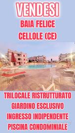 Trilocale Ingresso indipendente con Giardino Privato e Piscina - Relax a Due Passi dal Mare . Nel cuore di Baia Felice, nel comune di Cellole, proponiamo in vendita un grazioso appartamento al piano terra, inserito in un contesto residenziale elegante con piscina condominiale, spazi verdi ben curati e servizio di portineria. Una soluzione ideale per le vacanze o per chi desidera vivere in un ambiente tranquillo e ben servito. L'immobile ha una superficie commerciale di 65 m² calpestabili, gode di un'esposizione a sud che garantisce ambienti luminosi durante tutto il giorno ed è arricchito da un ampio giardino pavimentato ad uso esclusivo, perfetto per godersi momenti all'aperto in totale privacy. L'ingresso si apre su un accogliente soggiorno con angolo cottura, con accesso diretto al giardino; la camera matrimoniale e la cameretta sono entrambe dotate di porta-finestra che affaccia sul lato laterale del giardino, rendendo gli spazi ariosi e ben illuminati. Il bagno, moderno e ben rifinito, completa la zona notte. Inclusa nella proprietà anche la quota condominiale relativa al piano terra, con presenza del custode. Il residence offre inoltre una splendida piscina immersa nel verde e un servizio di animazione estiva per adulti e bambini. La posizione è strategica: a soli 10 minuti a piedi dal mare e a breve distanza da tutti i principali servizi, tra cui pizzerie, bar, minimarket, tabacchi, pub e bazar. Un'opportunità unica per chi cerca comfort, privacy e praticità in una delle zone più richieste della costa domizia. Contattaci subito per maggiori informazioni o per organizzare una visita!
