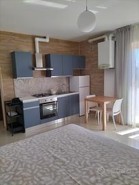 L'appartamento è composto da ingresso su luminosa zona giorno con terrazzo, dove troviamo una cucina completa ed attrezzata dei principali elettrodomestici, tavolo da pranzo con sedie, divano a due posti, armadio a muro e letto matrimoniale, infine ampio bagno finestrato con box doccia e lavatrice.