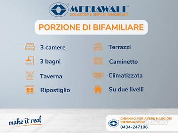 (Riferimento: BR-134-RV) Comune di Codroipo (BR-134-RV): zona residenziale e tranquilla in mezzo al verde, comoda a tutti i servizi, ampia e soleggiata porzione di bifamiliare di generose dimensioni, disposta su due livelli oltre all'interrato e così composta da: Piano Terra: ingresso, cucina arredata, soggiorno - pranzo dotato di caminetto, nel mezzanino troviamo il bagno finestrato con doccia e camera singola con terrazzo, Piano Primo: camera matrimoniale, camera doppia, bagno finestrato con vasca, due terrazzi, Piano Interrato: ripostiglio, taverna e bagno finestrato con doccia. L'abitazione è dotata di un ampio scoperto, di impianto di climatizzazione e caldaia nuova a condensazione. Ottime condizioni generali. Buona opportunità!!!! Contattaci per ulteriori informazioni e/o per effettuare un sopralluogo!!!!