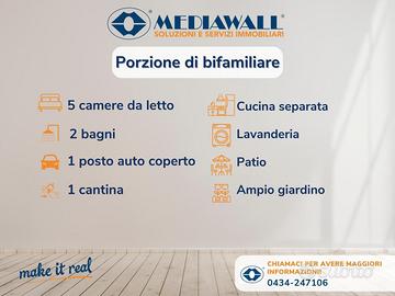 (Riferimento: BP-160-RV) Cordenons (Rif. BP-160-RV). In ottimo contesto verdeggiante, vicino a tutti i servizi e a poca distanza dalla piazza principale proponiamo in vendita porzione di casa bifamiliare costruita negli anni '80, ottimamente conservata, con ampio giardino esterno annesso, disposta su due livelli così composta: al piano terra, l'ingresso principale ci conduce nella zona giorno che è dotata di una spaziosa e luminosa cucina, un'ampia zona pranzo (attualmente arredata come seconda cucina ma che si presta a diverse soluzioni organizzative), luminoso e comodo soggiorno, bagno completo finestrato, zona lavanderia; da una scala interna si accede ad un asciutto e ben organizzato scantinato; sempre dal piano terra, si accede, attraverso una scala in legno, al primo piano, in cui troviamo un ampio disimpegno che conduce alle cinque camere presenti (tre matrimoniali e due camerette) e al secondo bagno finestrato completo. Accessoriata all'esterno da posto auto coperto e patio per godere del proprio giardino ogni qualvolta lo si desideri. Possibilità di acquisto della seconda porzione della bifamiliare, posta al secondo piano. Occasione da non perdere. Prenota la tua visita.