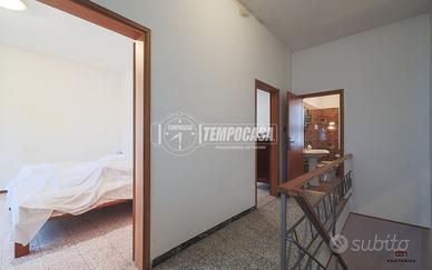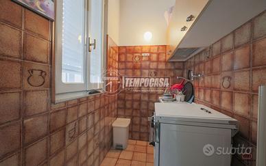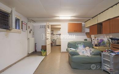 Ingresso su garage, attualmente diviso da tramezzo removibile, con cucinotto e bagno. A fianco si trova l'ingresso principale dell'abitazione con vano scale.