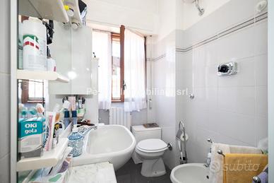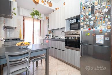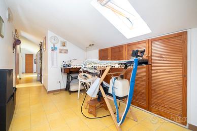 Posto al piano secondo una piccola palazzina in cortina degli anni '70 l'appartamento è composto da un soggiorno/pranzo con cucina abitabile attigua, entrambi con accesso al balcone perimetrale di circa 22 mq. La zona notte è composta da una camera matrimoniale e una cameretta adibita attualmente a studio, servite da bagno con doccia finestrato. Attraverso la scala interna, dal salone, si accede al secondo livello, dotato anche di ingresso indipendente, in cui l'ambiente mansardato con tetto spiovente, dotato di Velux automatiche con tende oscuranti di recente installazione, è stato sfruttato al massimo per accogliere un piccolo ingresso e due camere con bagno (con vasca). Completa la proprietà un box auto.