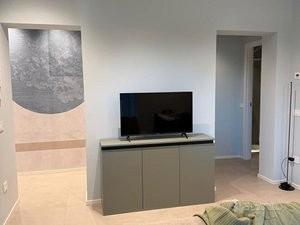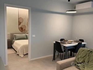La zona giorno vanta una cucina moderna e super accessoriata, perfetta per chi ama la funzionalità senza rinunciare al design. La zona notte comprende una confortevole camera da letto matrimoniale con ampia armadiatura con la possibilità di separare il letto in due singoli, una soluzione che rende l'appartamento adatto sia a coppie sia a colleghi o professionisti che condividono l'alloggio e un bagno moderno dotato di una funzionale doccia. L'appartamento dispone di una terrazza privata di circa 20 mq, uno spazio esterno vivibile dove è possibile sistemare un tavolino all'aperto, ideale per una colazione, un momento di relax o una pausa dopo il lavoro.