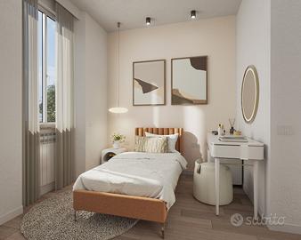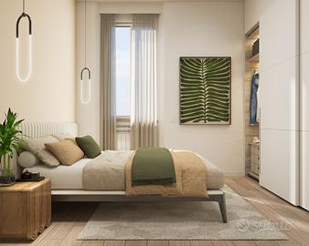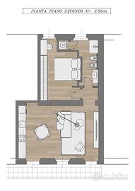 Si compone di soggiorno con cucina, camera da letto matrimoniale, disimpegno, comodo bagno finestrato con doccia e lavanderia.