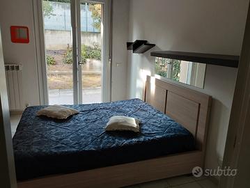 L'immobile é situato nel piano terra, di superficie 65mq. Composto di ingresso, cucina/soggiorno, camera e bagno. Un ampio giardino di 90 metri e 20 metri di garage privato.