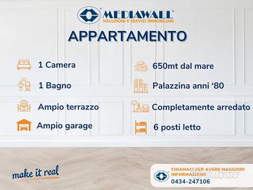 (Riferimento: BS-058-RV) Bibione (Rif. BS-058-RV) AMPIO MINIAPPARTAMENTO COMPLETAMENTE ARREDATO | AMPIO TERRAZZO ABITABILE | GARAGE DI 21MQ DI PROPRIETA' | CLIMATIZZATORE IN POMPA DI CALORE | 6 POSTI LETTO TOTALI | BASSE SPESE CONDOMINIALI | ACQUA FREDDA DISPONIBILE TUTTO L'ANNO | VERRA' RIQUALIFICATO IL TERRAZZO. A circa 650mt dal mare ed a soli 350mt dal centro pedonale, proponiamo in vendita quest'interessantissimo miniappartamento con ampio garage di 21mq di proprietà, posto al 2° piano (con ascensore) in palazzina costruita negli anni '80. L'appartamento ha un'esposizione ad "est", si sviluppa su circa 43mq interni, ospita comodamente 6 persone ed è così composto: ingresso con accesso diretto all'ampia zona cucina/soggiorno open-space con angolo cottura a vista (accessoriato anche di lavatrice) e divano/letto, piccolo disimpegno con armadiatura a muro di servizio, ampia camera da letto matrimoniale dotata anche di letto a castello, bagno con doccia e bidet. Completa la proprietà l'ampio e vivibilissimo terrazzo con doppio accesso (sia dalla zona giorno che dal reparto notte) ed, al piano semi-interrato, l'ampio e comodissimo garage di 21mq di proprietà. L'appartamento viene ceduto completamente arredato ed ha le seguenti dotazioni: pavimentazione in prefinito finto legno, infissi in alluminio, climatizzatore in pompa di calore (sostituito nel 2025) e blocco cucina totalmente accessoriato (sostituito nel 2020). ENTRO LA PRIMAVERA VERRA' RIFATTO TOTALMENTE IL TERRAZZO A CURA E SPESE DEL VENDITORE. La palazzina mette a disposizione l'acqua fredda tutto l'anno! Le spese condominiali ammontano a circa € 650,00- annue e comprendono: pulizia scale, luce scale, amministratore di condominio, assicurazione dello stabile, ascensore e l'utilizzo dell'acqua fredda. Contattaci e non farti scappare quest'opportunità, programma la tua visita oppure vieni a trovarci presso il nostro ufficio di Bibione in Cor