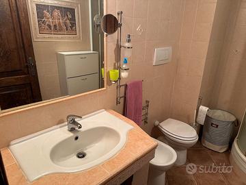 Bagno senza finestra con box doccia e scaldabagno elettrico, dotato di piccolo soppalco sopra l'ingresso utile per riporvi oggetti, cambi stagionali etc.