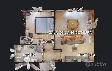 Immobile al piano terra con buona distribuzione degli spazi composto da ingresso su soggiorno con cucina a vista, disimpegno, una camera matrimoniale e un bagno.