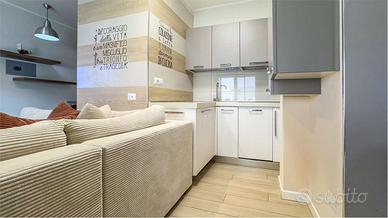 Limmobile, impreziosito da una pavimentazione in parquet, è dislocato su due livelli, uno fuoriterra ed uno seminterrato, e si compone al piano terra di open space con cucina a vista, servito da bagno con doccia ed annesso tramite porta finestra ad un riservato cortile, ideale per momenti di relax allaria aperta e pranzi in compagnia.