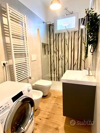 camera matrimoniale moderna; bagno con ampia doccia walk-in e lavasciuga.