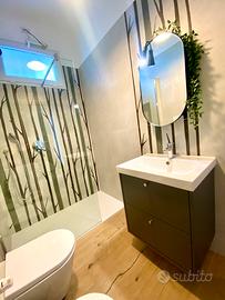 ampio soggiorno con cucina completa di elettrodomestici, divano e tv 55". Il bagno, è dotato di una doccia spaziosa e finiture di qualità .