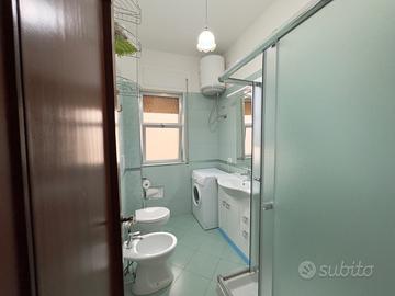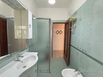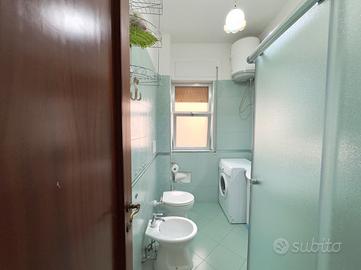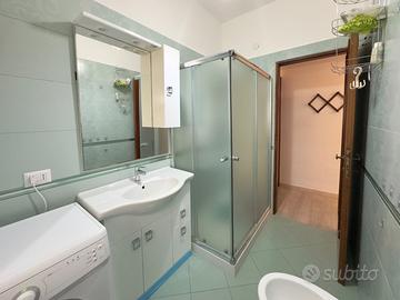 Il bagno è completo di box doccia, lavabo, sanitari e lavatrice, inoltre finestrato, importante per il ricircolo d'aria.