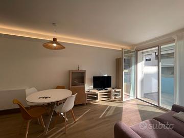 Bilocale di recentissima costruzione posto in zona regioni, al piano primo di una palazzina servita di ascensore. L'accesso avviene nel soggiorno con angolo cottura, ampio terrazzo vivibile, disimpegno notte, bagno con finestra e camera matrimoniale che accede al solito terrazzo. Autorimessa esclusiva al piano interrato. Riscaldamento e acqua calda sanitaria alimentate dall'impianto fotovoltaico rimborsate con le spese condominiali.