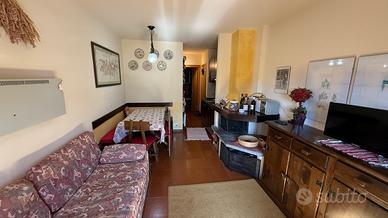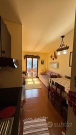 Vendesi grazioso e panoramico bilocale con BOX a 500 mt dalle piste da sci, posto al piano terzo, servito da ascensore, composto da soggiorno con divano letto e camino, angolo cottura, camera con 4 letti a castello, bagno. Al piano terra si trova lo ski-box e box auto privato. Giardino condominiale. Riscaldamento autonomo elettrico, cottura con piastra ad induzione, acqua calda con boiler elettrico. Completamente arredato in stile montano.