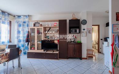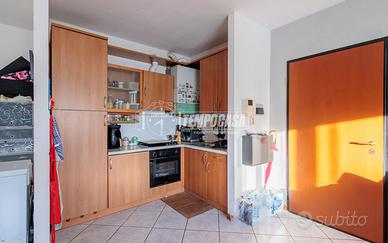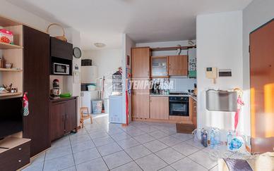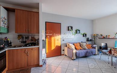Ingresso su soggiorno accogliente con cucina a vista, ambiente moderno e funzionale.