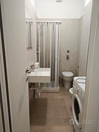bagno con doccia, WC, bidet, lavandino e lavatrice.