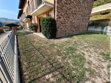 Proponiamo in vendita nel comune di Alba e precisamente in Località San Rocco Cherasca, alle porte delle Langhe, che dista pochi chilometri dal centro della città in direzione Cortemilia, ampio appartamento bilocale realizzato in piccolo complesso residenziale costituito da 10 unità abitative, con autorimessa e cantina. L'immobile sito al piano terreno si compone di un ingresso nella zona giorno con soggiorno ed angolo cottura, un disimpegno che separa la zona giorno da quella notte, una camera da letto matrimoniale ed un bagno con doccia e vasca. Libero su tre lati, l'appartamento dispone di un ampio giardino e terrazzo privati e recintati, grande garage e cantina/ripostiglio. Se ci fosse la necessita di avere un garage per due auto è sufficiente eliminare la tramezzatura della cantina. Termoautonomo, con predisposizione (solo tubazioni) per l'impianto di raffrescamento estivo mediante sistema "split-system "a gas ecologico, sistema di irrigazione giardino che attinge ad un pozzo condominiale e basse spese di gestione condominiali. Serramenti in legno con doppi vetri e portoncino di ingresso blindato. PER INFORMAZIONI E/O VISITE CONTATTARE LAURA
