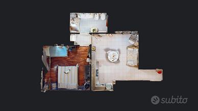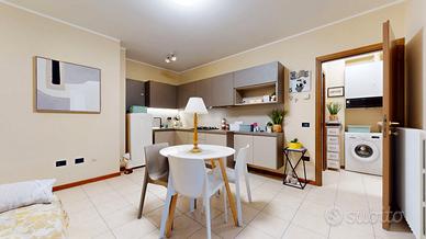 L'appartamento si apre su un luminoso soggiorno con accesso diretto al terrazzo vivibile. Un comodo disimpegno conduce alla camera matrimoniale e al bagno.