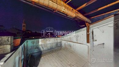 La soluzione è composta da ingresso su luminosa sala con angolo cottura, dalla quale si accede direttamente a un terrazzo abitabile con suggestiva vista sul campanile, uno spazio esclusivo e di grande fascino, ideale per momenti di relax all'aperto, colazioni o cene in compagnia.