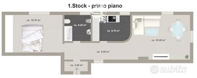L'appartamento colpisce per la distribuzione funzionale degli spazi: dall'ingresso si accede al luminoso soggiorno, che offre spazio sufficiente per una confortevole zona living e pranzo. La cucina separata è funzionale e consente di mantenere ben distinti gli ambienti. La camera da letto è spaziosa, mentre il bagno dispone di finestra. Un comodo ripostiglio offre ulteriore spazio per l'organizzazione domestica.