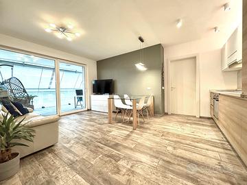 Luminoso soggiorno con cucina open space e accesso diretto alla grande terrazza vivibile
