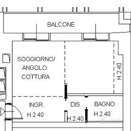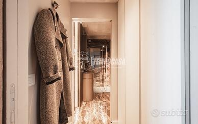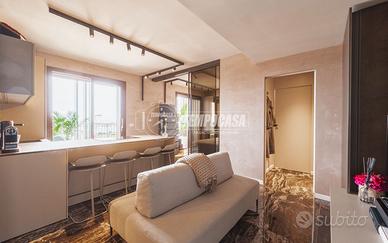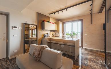 - L'ingresso conduce a un luminoso soggiorno con cucina a vista, che si apre su un terrazzo
