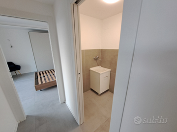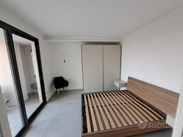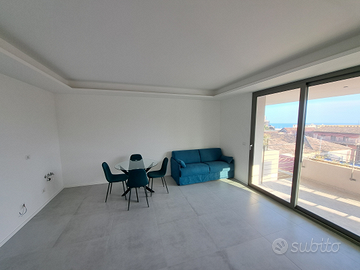 L'appartamento, sito in via Scuto Costarelli 35, è composto da: - ampia cucina soggiorno con balcone; - camera da letto con balcone; - bagno con finestra; - lavanderia con lavabo e lavatrice. La cucina (completa di tutti gli elettrodomestici) ed il resto dell'arredamento verrà allestito entro marzo e la casa sarà disponibile dal 10 Aprile. L'immobile, essendo di nuova costruzione è stato costrutito con tecniche antisismiche ed è dotato di porta blindata, videocitofono, infissi a taglio termico, sistema di climatizzazione caldo/freddo canalizzato. Stazione centrale con collegamenti aeroportuali e Metropolitana a 100m. Utenze non incluse nel prezzo. Possibilità di posto auto coperto e numerato al piano -1 collegato all'appartamento tramite ascensore (+150€).