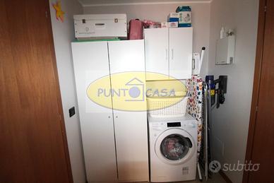 Soggiorno, cucina a vista con accesso al balcone, disimpegno con angolo lavanderia, camera da letto con accesso al balcone, bagno dotato di box doccia.