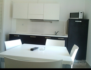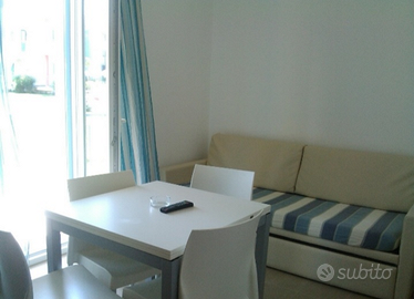 Bilocale (50 mq) per 5 persone, con camera da letto matrimoniale e letto aggiunto, ampio soggiorno con divano letto a 2 posti, angolo cottura attrezzato di stoviglie e pentole, bagno con doccia e phono, 2 balconi, aria condizionata autonoma, TV LCD, frigo, forno a microonde, telefono, biancheria da letto e da bagno con pulizia settimanale compresa.