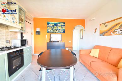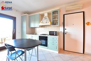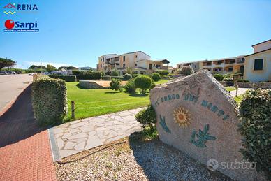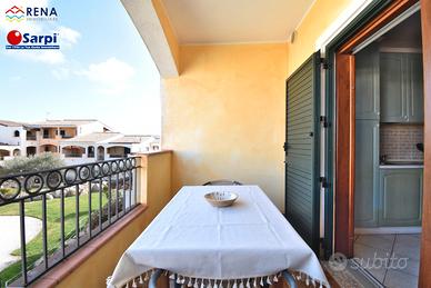 All'interno del complesso residenziale "Il Borgo dei Mirti" proponiamo in vendita un interessante appartamento bilocale al primo piano con ampia terrazza. L'immobile è composto da un luminoso soggiorno con angolo cottura, una camera da letto matrimoniale e un bagno completo di box doccia. All'esterno è presente una terrazza abitabile con affaccio sulla splendida piscina condominiale. L'appartamento è rifinito e arredato con grande cura, dotato di pompe di calore caldo/freddo ed è pronto per essere abitato. Il complesso residenziale "Il Borgo dei Mirti" sorge a meno di 1 km dalla spiaggia della Rena Bianca e a soli 700 metri dal centro del paese. Al suo interno si trovano due bellissime piscine ad uso esclusivo dei condomini. Completa la proprietà un posto auto scoperto in area condominiale ad uso esclusivo dei condomini.