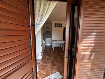 L'appartamento, accogliente e ben curato, è composto da soggiorno con angolo cottura, bagno e una veranda coperta con tetto in legno, ideale per rilassarsi o cenare all'aperto.