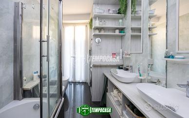 Bagno luminoso completamente ristrutturato, dotato di vasca e porta per la doccia, zona lavanderia e un comodo balconcino che affaccia internamente alla corte.