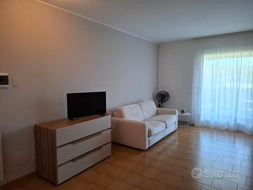 Con piscina e 20.000 mq di verde, bilocale arredato con portico e giardino vista lago, posto auto coperto.