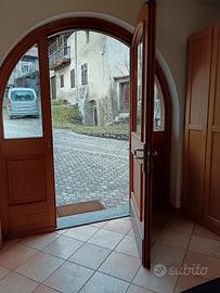 L'ingresso spazioso conduce a un soggiorno accogliente con angolo cottura in legno massiccio, dove una stufa ad olle tipica di montagna crea un'atmosfera calda e invitante e la finestra ad arco offre un panorama sempre diverso sulle montagne circostanti così come la porta finestra che va sul poggiolo