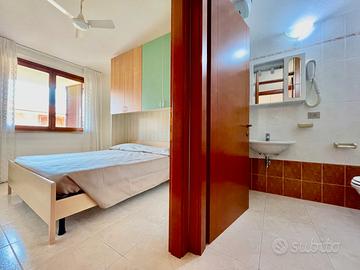Internamente l'immobile è composto da un pranzo-soggiorno luminoso, climatizzato, e arredato di parete cottura e comodo divano. Alla sinistra della zona giorno, un disimpegno ci conduce alla camera da letto matrimoniale e al bagno completo di doccia.