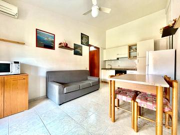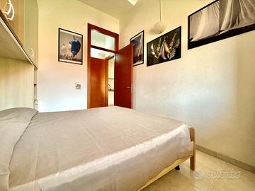 Internamente l'immobile è composto da un pranzo-soggiorno luminoso, climatizzato, e arredato di parete cottura e comodo divano. Alla sinistra della zona giorno, un disimpegno ci conduce alla camera da letto matrimoniale e al bagno completo di doccia.