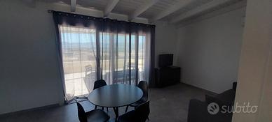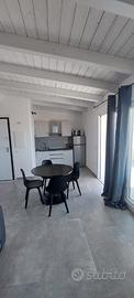 zona living con angolo cottura completo di fornelli a induzione, frigorifero, microonde e macchina del caffè, con accesso diretto alla terrazza, camera matrimoniale e bagno privato moderno, lavatrice.