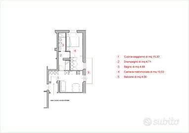 L'appartamento è al terzo ed ultimo piano di una palazzina e internamente comprende, oltre all'ingresso, un soggiorno con cucina a vista e balcone, una camera matrimoniale, un bagno e un ripostiglio.