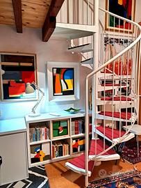 La zona giorno è luminosa e accogliente, caratterizzata da tonalità calde e da una parete artistica che dona personalità all'ambiente. Una scala a chiocciola bianca collega la zona giorno al soppalco, dove si trova la zona notte raccolta, impreziosita da travi antiche a vista.