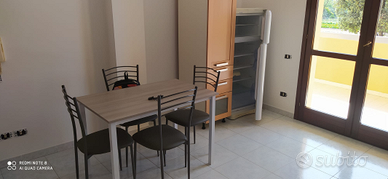 Composto da: Salone con angolo cottura, disimpegno, camera da letto matrimoniale, bagno con veranda e ulteriore veranda esterna lato strada. Dispone di un posto auto interno con accesso da cancello elettrico, e posto auto esterno. Completamente arredato, sono presenti anche lavatrice, scaldabagno, due condizionatori, piano cottura, forno, cappa, frigo libera installazione.