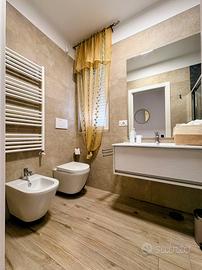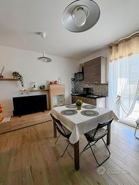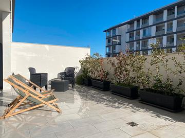 Composto da ingresso su zona giorno, camera da letto con cabina armadio e bagno finestrato con doccia e termoarredo, l'appartamento è dotato di infissi a taglio termico, zanzariere, WI-FI, cucina attrezzata con piano cottura a induzione, divano e TV . Camera da letto con letto matrimoniale completa di arredi e TV, autoclave personale e fan coil in stabile gas free. Il balcone terrazzato di 50 mq è attrezzato di tavolo, ombrellone da giardino, lavatrice e vano tecnico. Completa l'immobile una cantina di pertinenza e un posto auto coperto.